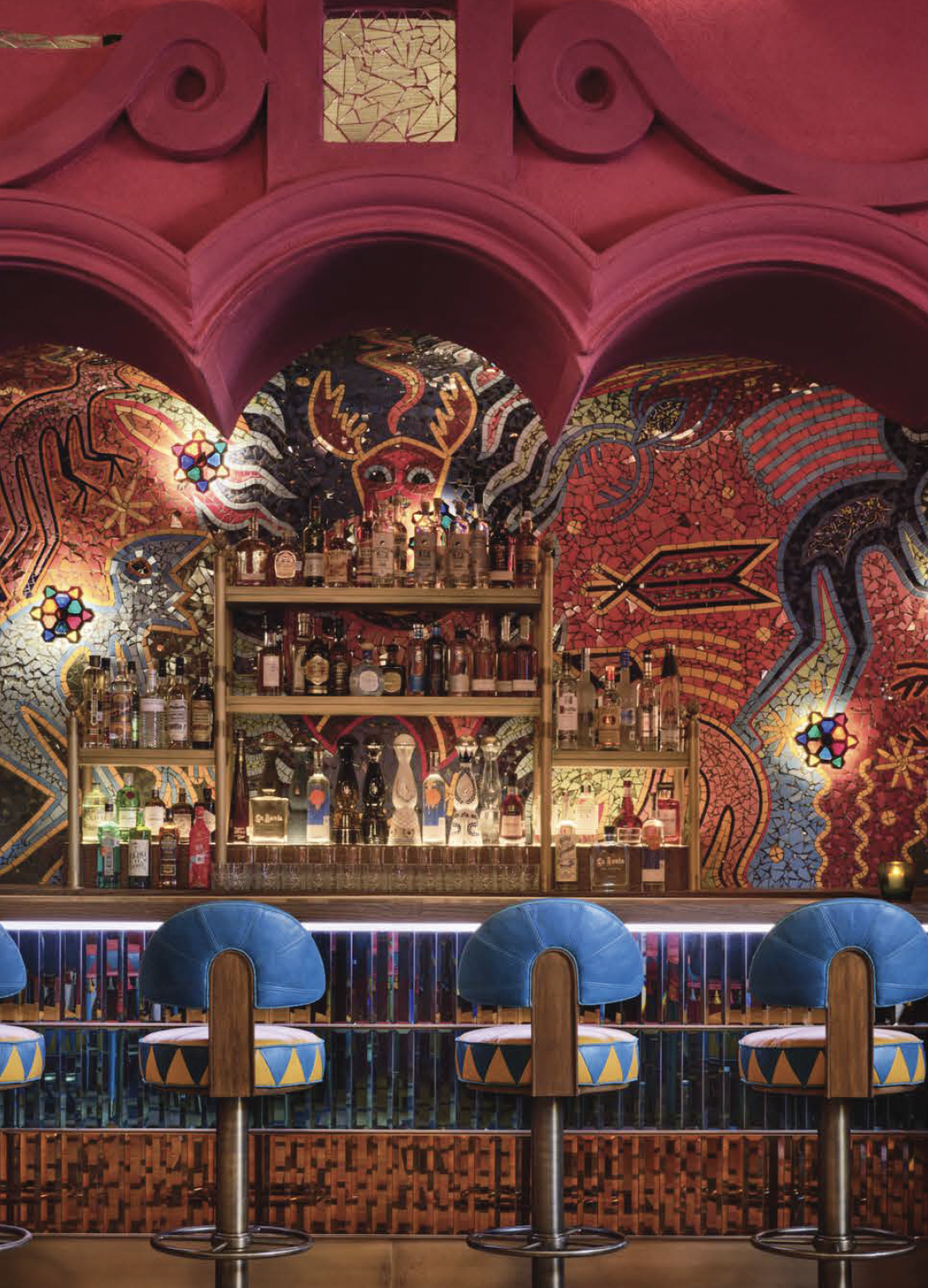 The speakeasy aesthetic offers a variety of seating experiences, including intimate booths designed for relaxing before or after hitting the dance floor, as well as outdoor seating in a central courtyard. Everywhere, murals and mosaics bring the walls to life in a deeply rooted Mexican style.